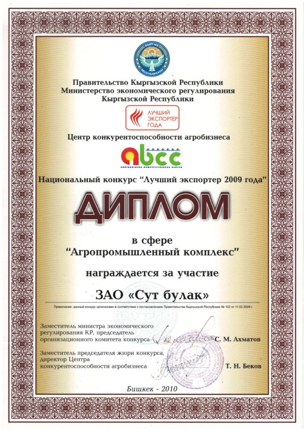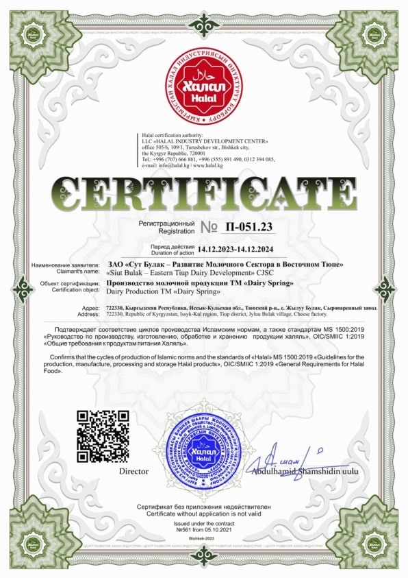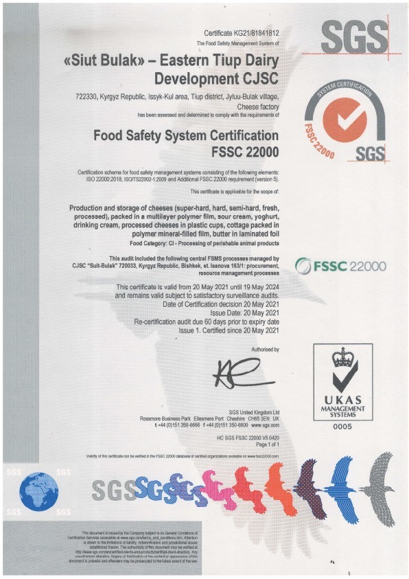 2017-жылы биз FSSC 22000 сертификация процедурасынын талаптарына ылайык, азык-түлүк коопсуздугун башкаруу системасын ишке киргизип, сертификат алдык. FSSC 22000 сертификациясы, айрыкча сүт тармагында, тамак-аш технологиясы жана өндүрүшү жаатында жогорку абройго ээ. Ал биздин продукция керектөө үчүн коопсуз экенин жана бардык эл аралык сапат стандарттарына жооп берген шарттарда өндүрүлөрүн кепилдейт.